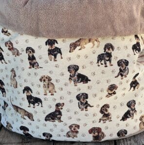 Weelderig zacht is dit met velvet gevoerde soezelnest, de teckel is een levensgenieter pure sang en weet dit als geen ander te waarderen. Gemaakt van gobelin met mooie ingeweven teckeltjes in mooie natuurlijke kleurschakering. De tussenvoering van sterke meubelstof geeft het nest een angename stevigheid.